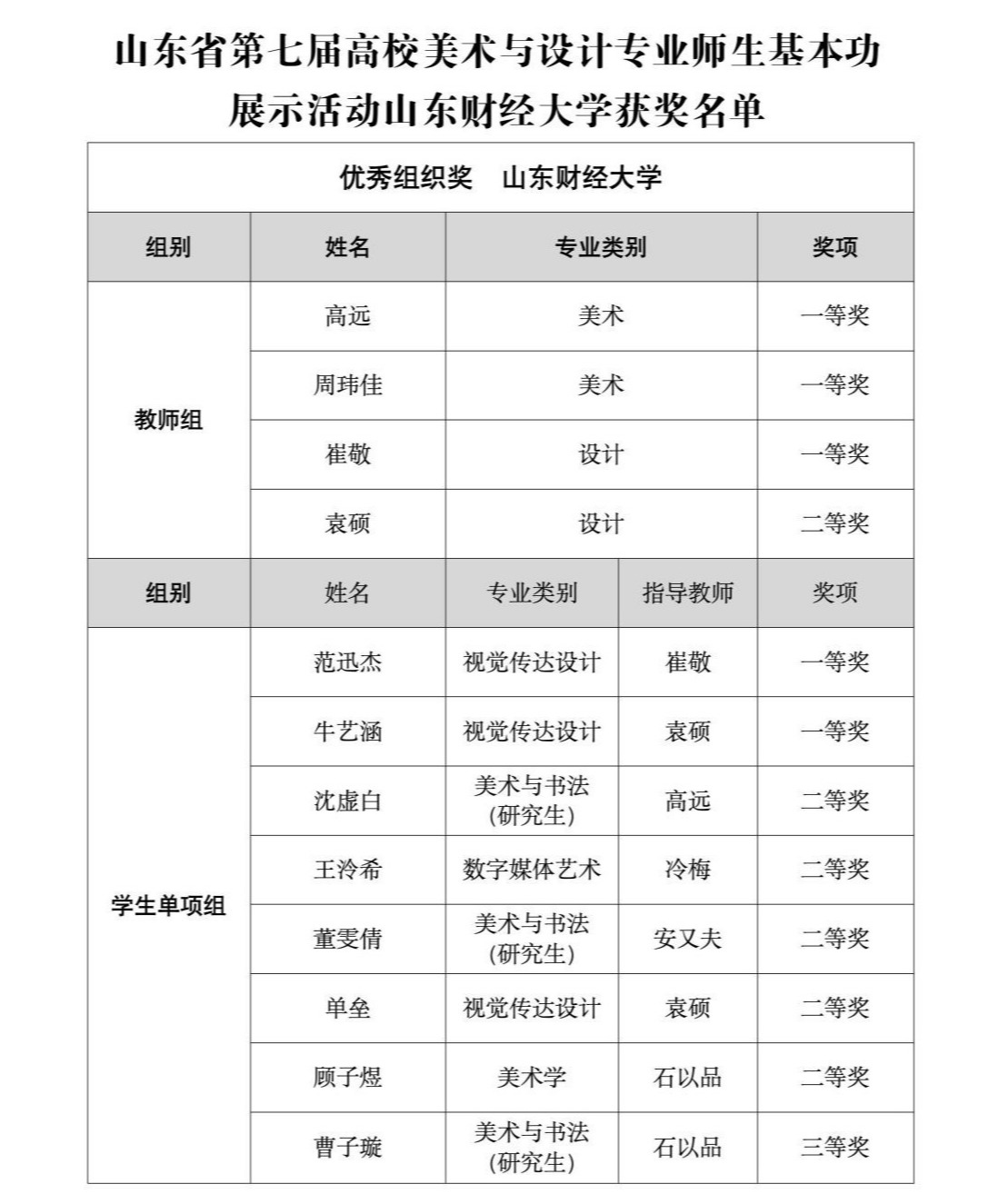 师生在此次赛事中表现亮眼、斩获佳绩,共揽获12项荣誉,创历届参赛最佳战绩。其中教师组摘得一等奖3项、二等奖1项;学生单项组收获一等奖2项、二等奖5项、三等奖1项。学校荣获“优秀组织奖”,充分彰显了我校美育教学的丰硕成果。